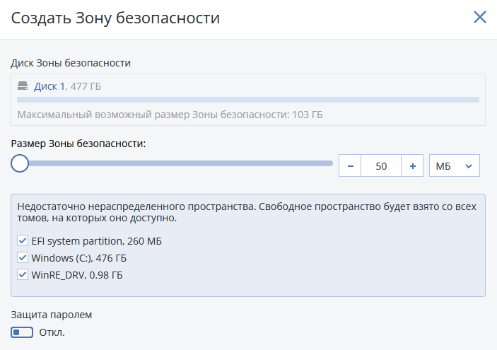 Этот пароль потребуется для доступа к резервным копиям, расположенным в Зоне безопасности. Для резервного копирования в раздел Зона безопасности пароль не требуется, за исключением случая, когда резервное копирование выполняется в системе, загруженной с загрузочного носителя.