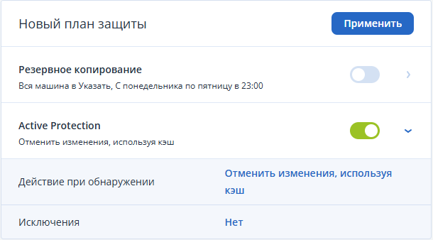 По умолчанию служба Active Protection выключена. Чтобы активировать её, в веб-консоли Кибер Бэкап перейдите на вкладку Планы > Защита, выберите план защиты из списка и на панели Действия щёлкните Изменить (либо создайте новый план защиты, подробнее см. раздел Создание плана защиты), затем переведите соответствующий переключатель в положение Включено.