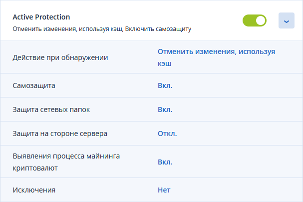 Для перехода к настройкам параметров службы Active Protection нажмите на стрелку справа от переключателя. Вид окна настроек службы Active Protection на машине с ОС Windows приведён на рисунке.
