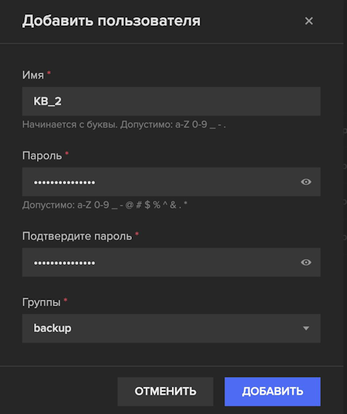 В системе хранения данных YADRO TATLIN.UNIFIED создайте пользователя, добавьте его в группу backup и сохраните его учетные данные. Эти учетные данные будут использоваться сервером управления Кибер Бэкап для подключения к API системы хранения данных.