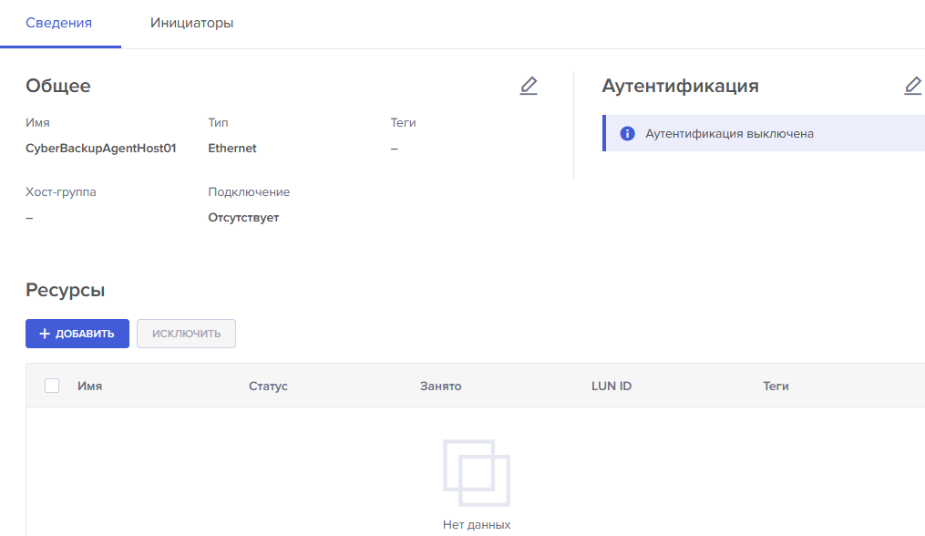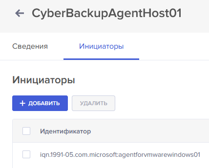 В хранилище данных YADRO TATLIN.UNIFIED создайте хост с именем CyberBackupAgentHost<уникальный_суффикс> и добавьте для него IQN-имя iSCSI-инициатора машины. Ресурсы добавлять не нужно.