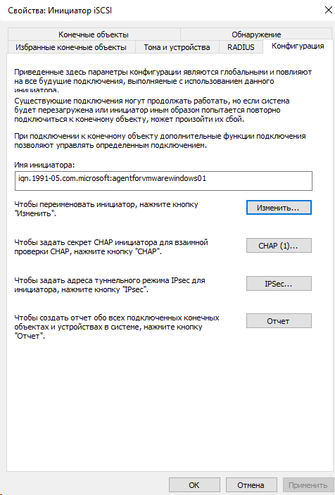 Запустите приложение Инициатор iSCSI и на вкладке Конфигурация получите IQN-имя iSCSI-инициатора машины.