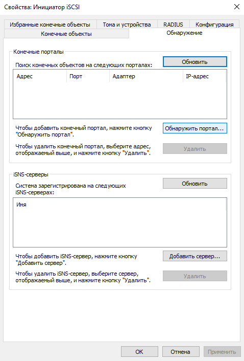 Проверьте, что iSCSI-инициатор может подключиться к хранилищу данных. Для этого в приложении Инициатор iSCSI на вкладке Обнаружение добавьте портал обнаружения хранилища данных, перейдите на вкладку Конечные объекты и подключитесь к обнаруженному конечному объекту.