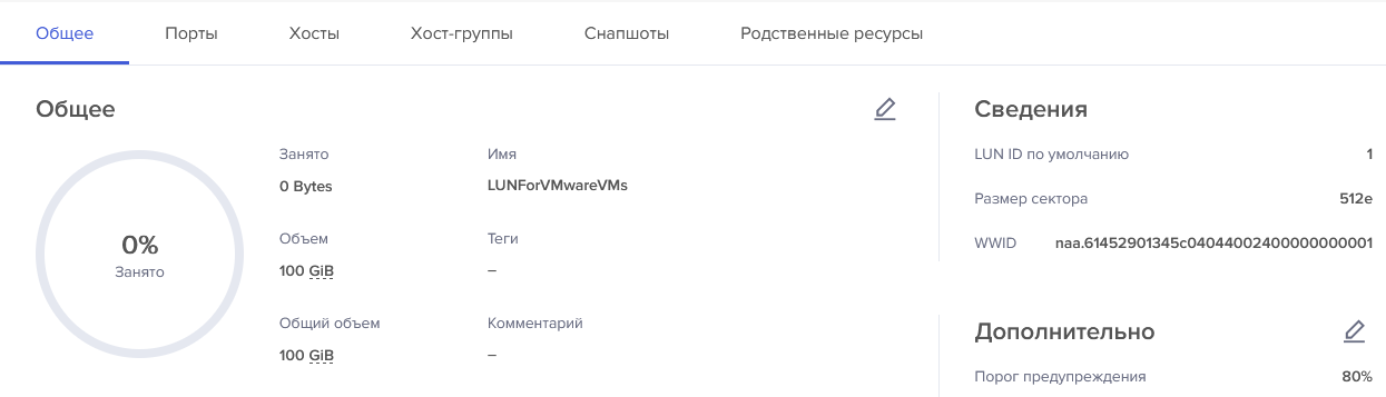 В пуле создайте блочный ресурс (LUN) необходимого размера для размещения дисков виртуальных машин. При создании ресурса необходимо выбрать размер сектора 512e.