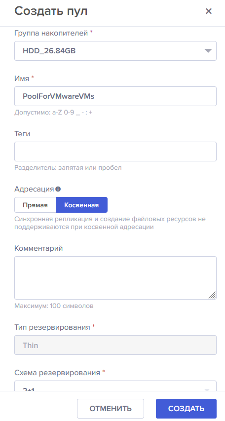 В хранилище данных YADRO TATLIN.UNIFIED создайте пул с косвенной адресацией.