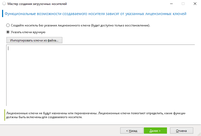Если не указать лицензионный ключ, полученный загрузочный носитель можно использовать только для операций восстановления и доступа к компоненту Универсальное восстановление (Universal Restore).