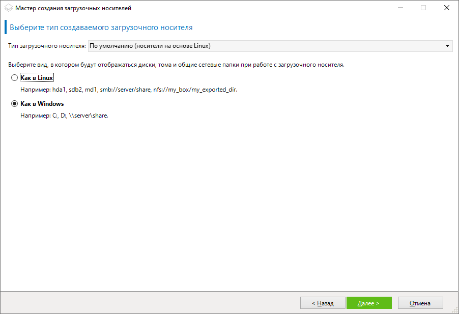 Выберите Тип загрузочного носителя: По умолчанию (носители на основе Linux).