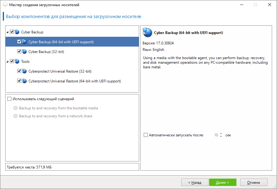 Выберите компоненты, которые будут размещены на носителе: загрузочный агент Кибер Бэкап и (или) Универсальное восстановление (Universal Restore), если вы планируете восстанавливать систему на отличающееся оборудование.