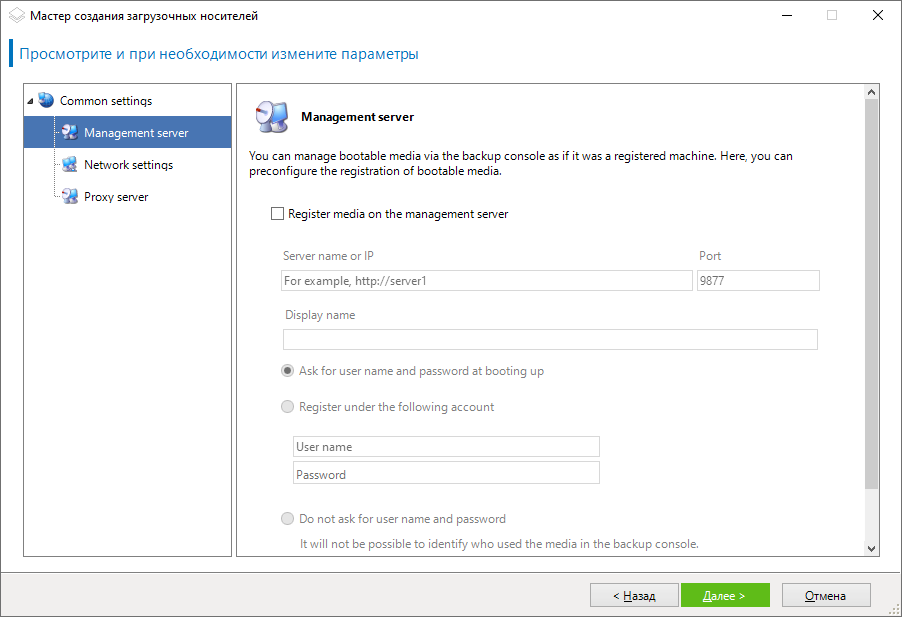 [Необязательно] Выберите способ регистрации носителя на сервере управления при загрузке. Дополнительную информацию о настройках регистрации см. в разделе Сервер управления.