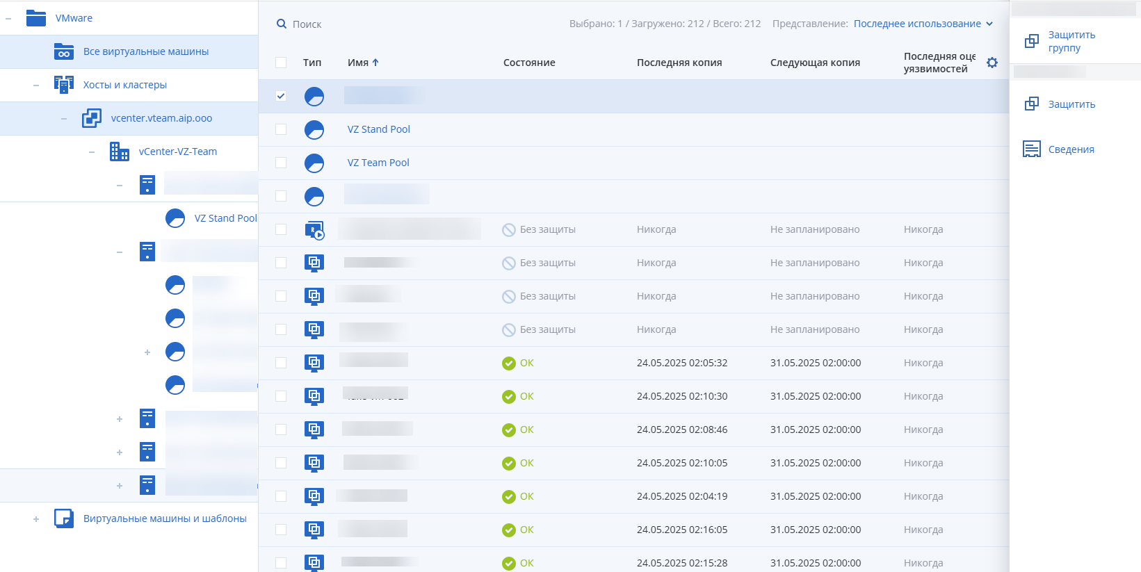 Например, вы выбрали кластер, а затем — пул ресурсов в нем. Если щелкнуть Защитить, будет создана резервная копия для всех виртуальных машин в выбранном пуле ресурсов. Если щелкнуть Защитить группу, будет создана резервная копия для всех виртуальных машин в кластере.