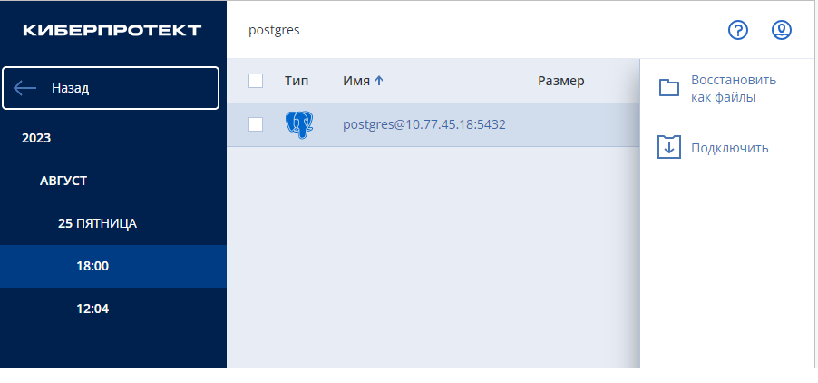 - Выберите нужный архив для подключения и нажмите Восстановить данные PostgreSQL.