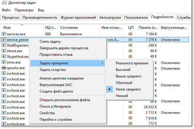 - Приоритет ЦП: Низкий (соответствует значению Ниже среднего).