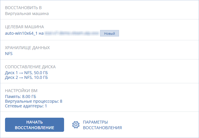 - Выберите машину, в которую будут выполняться восстановление: новая или существующая. Выбор новой машины предпочтительнее, поскольку для нее не требуется, чтобы конфигурация диска целевой машины в точности соответствовала конфигурации диска в резервной копии.