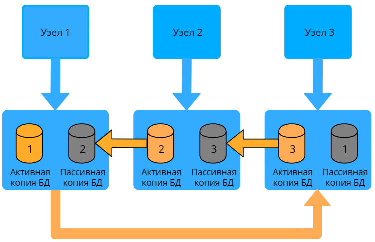 Группа DAG включает до 16 серверов почтовых ящиков Exchange. На любом узле может располагаться копия базы данных почтовых ящиков с любого другого узла. Каждый узел может содержать пассивные и активные копии базы данных. Может быть создано до 16 копий каждой базы данных.