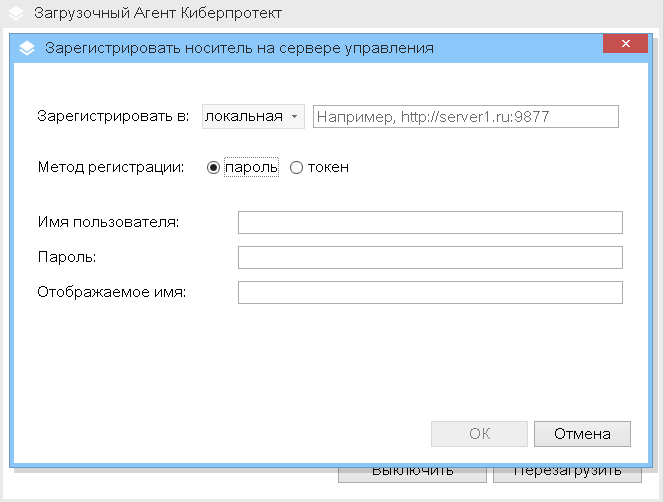 Параметры регистрации могут быть предварительно настроены в опции Сервер управления Bootable Media Builder. Если все параметры регистрации настроены предварительно, носитель автоматически отображается на веб-консоли Кибер Бэкап. Если некоторые параметры настроены предварительно, некоторые шаги описанной далее процедуры могут быть недоступны.