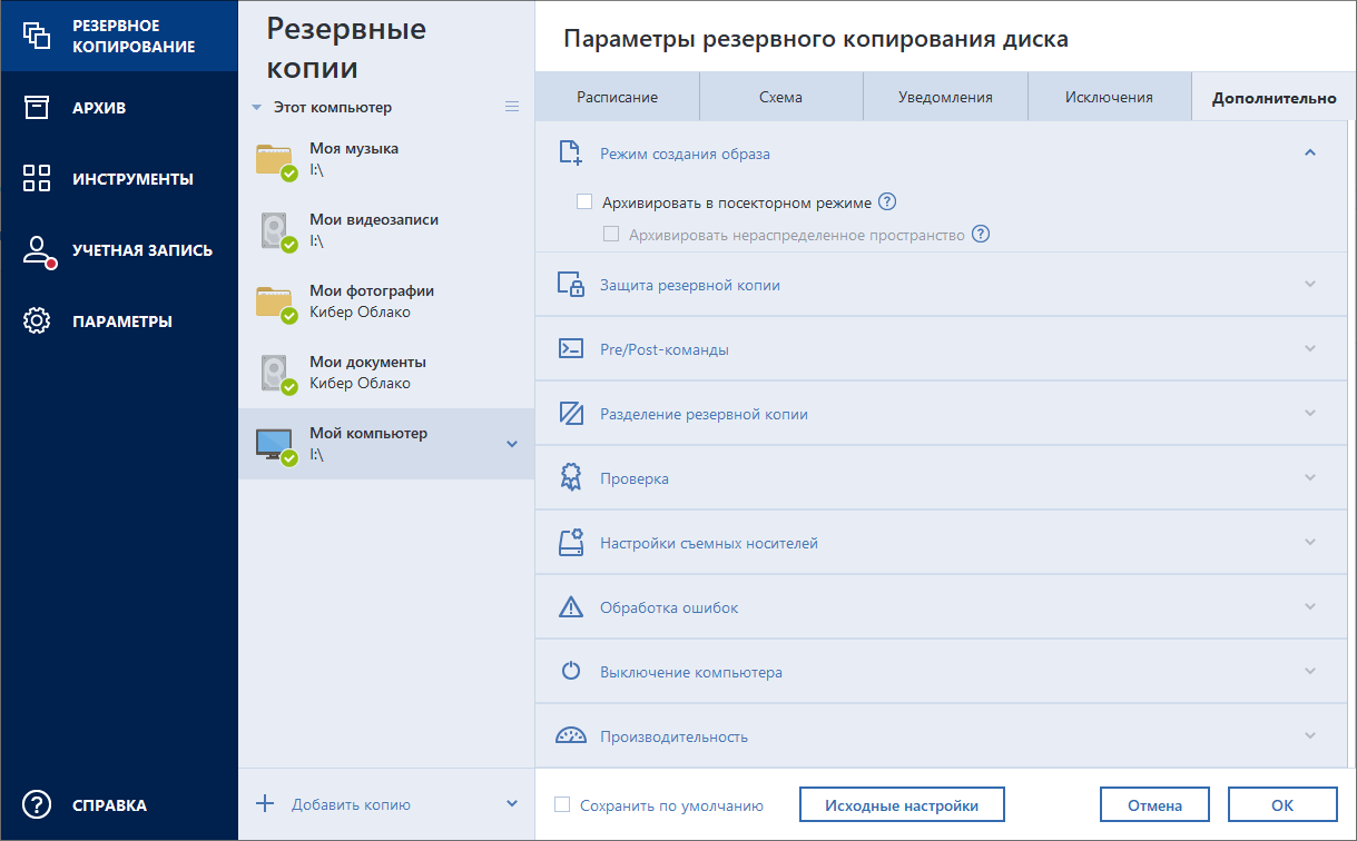 Следует учитывать, что параметры для каждого типа резервного копирования (на уровне дисков, на уровне файлов, в онлайн-хранилище) являются полностью независимыми и их следует настраивать отдельно.