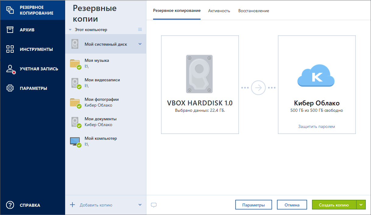 При резервном копировании данных в Кибер Облако создание первой резервной копии может занять длительное время. Последующие операции резервного копирования должны происходить намного быстрее, так как через Интернет будут передаваться только изменения в файлах.