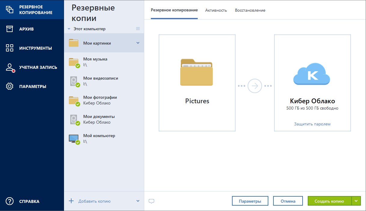- Чтобы немедленно выполнить резервное копирование, щелкните Создать копию.