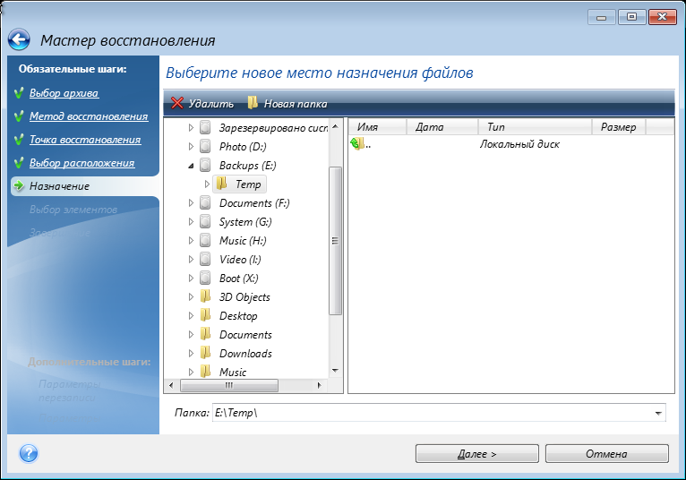 - При восстановлении файлов с помощью загрузочного компакт-диска можно выбрать только новое хранилище для восстанавливаемых файлов. Поэтому просто нажмите кнопку Далее на шаге Выбор расположения.