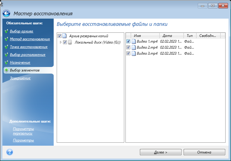 На шаге Выбор элементов выберите несколько файлов для восстановления, установив напротив них флажки, и нажмите кнопку Далее.