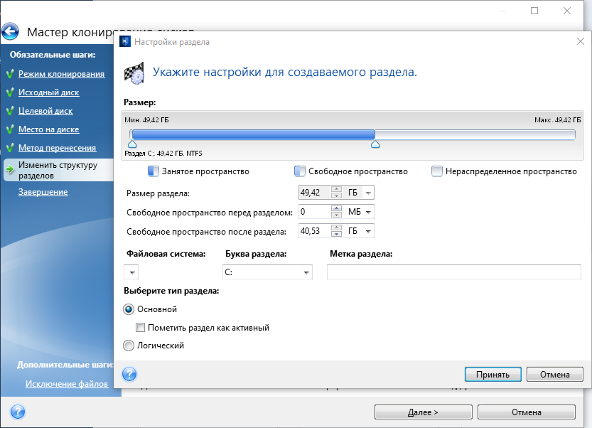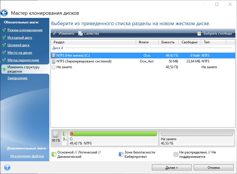 Ручной способ переноса позволяет изменить размеры любого раздела на новом диске. По умолчанию программа изменяет размер разделов пропорционально.