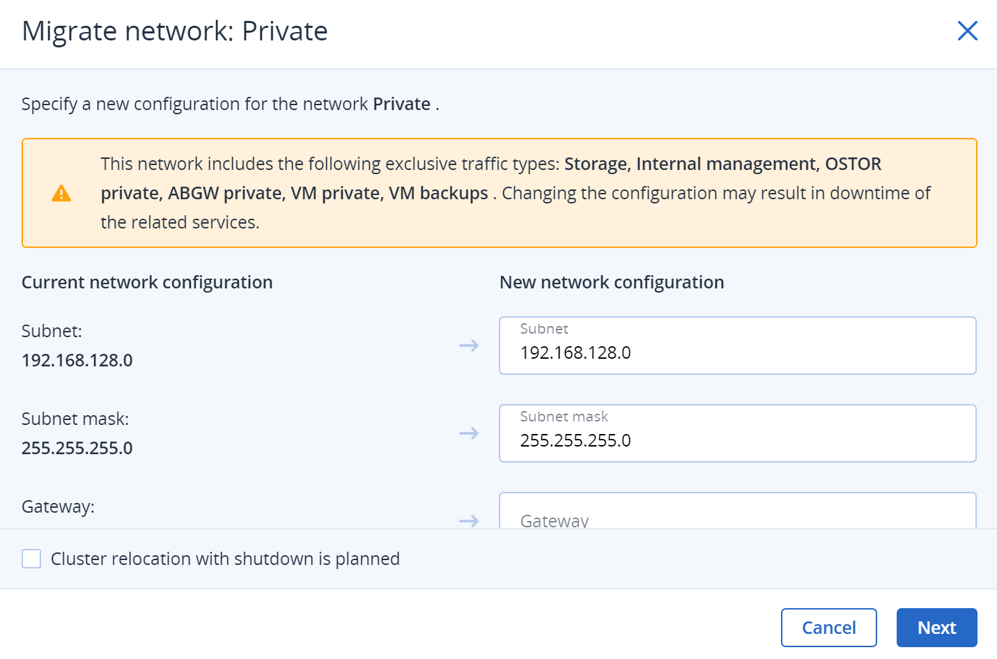 vinfra cluster network migration start <network> [--subnet <subnet>] [--netmask <netmask>] [--gateway <gateway>] [--shutdown] [--node <node> <address>]--network <network>- Идентификатор или имя сети