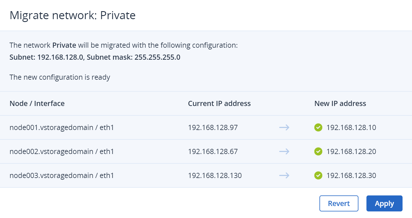 # vinfra cluster network migration start --network "Private" \ --subnet 192.168.128.0 --netmask 255.255.255.0 --node node001 192.168.128.11 \ --node node002 192.168.128.12 --node node003 192.168.128.13 +----------------------------+--------------------------------------------------+ | Field | Value | +----------------------------+--------------------------------------------------+ | configuration | network_id: 3e3619b7-2c93-4e90-a187-135c6f8b9060 | | link | href: /api/v2/network/migration/2d4ec3a9-<...>/ | | | method: GET | | | rel: network-migration-details | | operation | network-migration | | progress | 0.0 | | single_interface_migration | False | | state | preparing | | task_id | 2d4ec3a9-7714-479d-a03c-1efbe6ffecf5 | | transitions | 0 | +----------------------------+--------------------------------------------------+