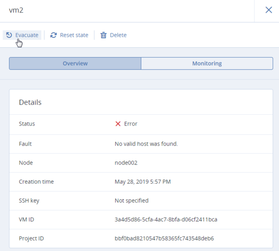 Если что-либо препятствует эвакуации, например на вычислительных узлах назначения не хватает ресурсов для размещения затронутых виртуальных машин, эти ВМ остаются на отказавшем узле и получают статус «Ошибка». Их можно эвакуировать вручную после устранения проблемы (обеспечения достаточного объема ресурсов, присоединения новых узлов к кластеру и т. д.).