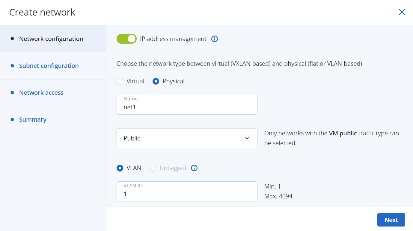 - Чтобы создать сеть на базе VLAN, выберите VLAN и укажите идентификатор VLAN. Чтобы создать плоскую физическую сеть, выберите Untagged (Без тега).