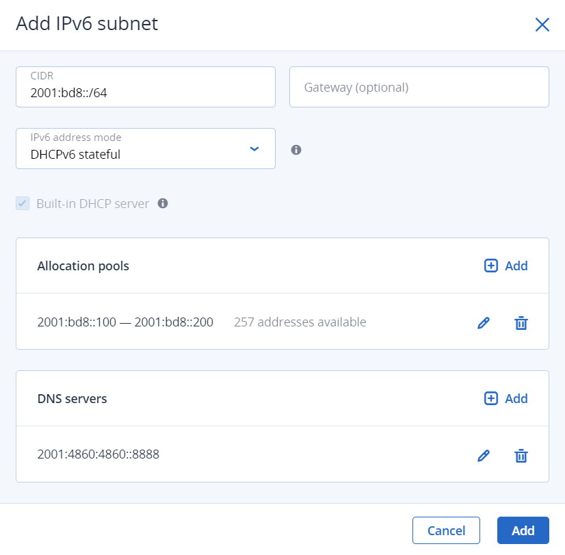 - Если вы выбрали режим адресации IPv6 DHCPv6 stateless (без отслеживания состояния) или DHCPv6 stateful (с отслеживанием состояния), укажите DNS-серверы, которые будут отправлены виртуальным машинам через встроенный DHCP-сервер.