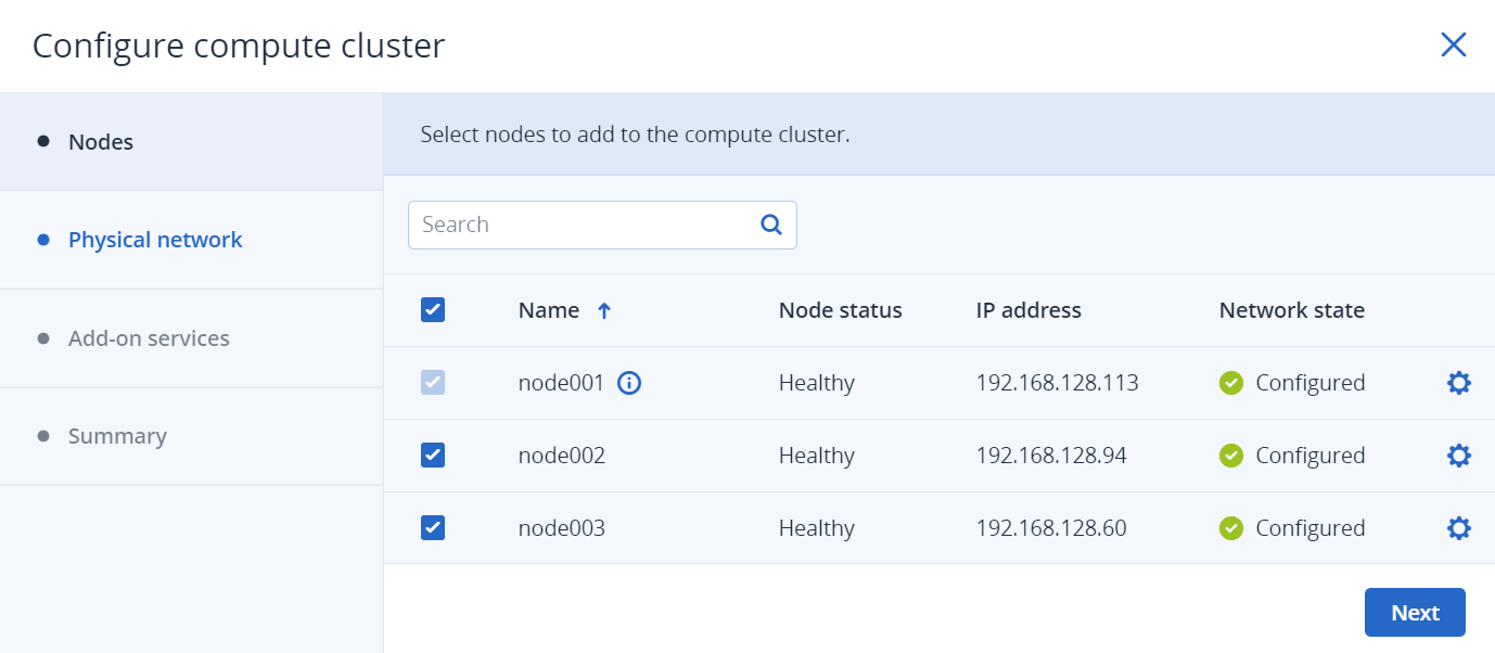 - Выберите серверы для добавления в вычислительный кластер. Можно выбрать только серверы с состоянием сети Настроено. Серверы в кластере высокой доступности сервера управления автоматически выбираются для присоединения к вычислительному кластеру.