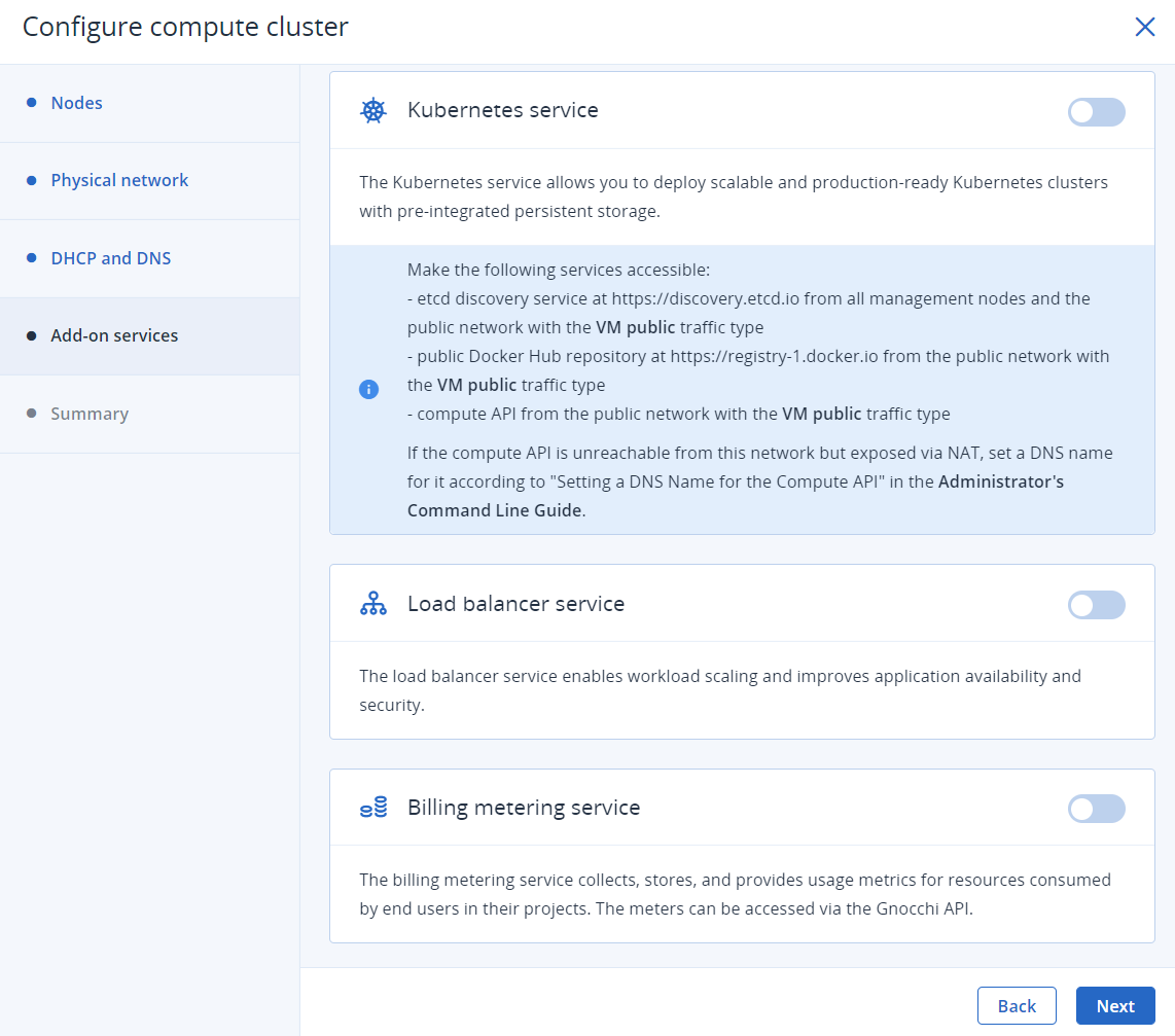 На шаге Дополнительные сервисы включите сервисы, которые будут установлены во время развертывания вычислительного кластера. Эти сервисы также можно установить позже. Затем нажмите кнопку Далее.