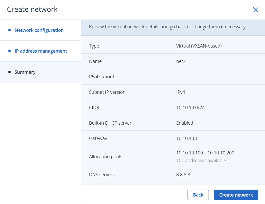 На шаге Сводка просмотрите конфигурацию и нажмите Создать сеть.
