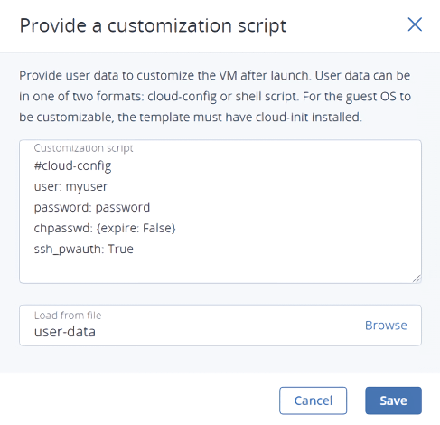 Добавьте пользовательские данные для настройки ВМ после запуска, например, для изменения пароля пользователя.