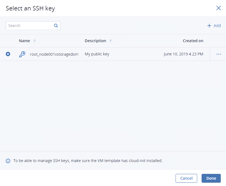 В вычислительный кластер добавлен SSH-ключ, как показано в разделе Добавление ключей SSH для виртуальных машин. SSH-ключ можно указать только при создании ВМ из шаблона или загрузочного тома.
