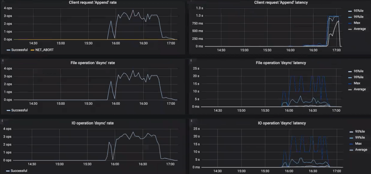 Превышения времени ожидания сторожа ввода-вывода. Если диаграмма не пуста, это значит, что базовое хранилище испытывает неполадки и не может обеспечивать требуемую производительность.