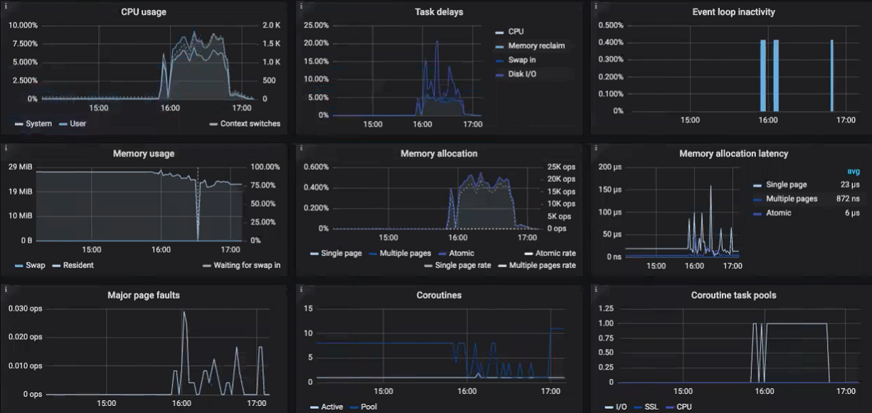 - ЦП/ОЗУ: загрузка ЦП в процентах по времени и использование ОЗУ в ГиБ по времени