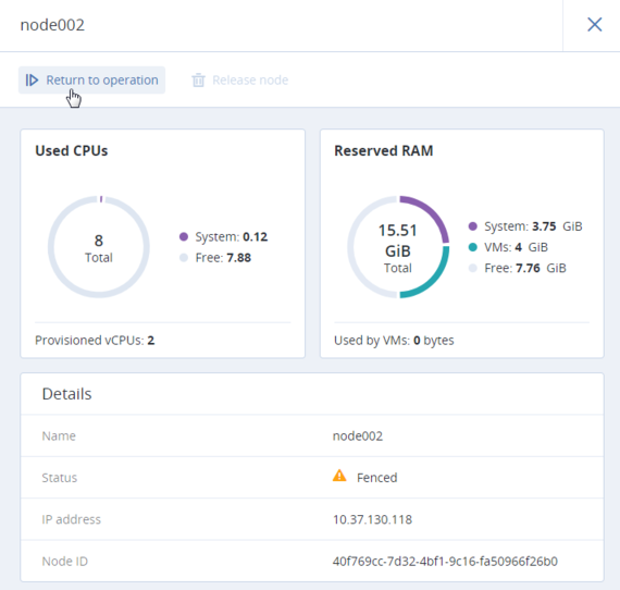 При необходимости можно вернуть узел в огражденное состояние с помощью команды vinfra service compute node fence.