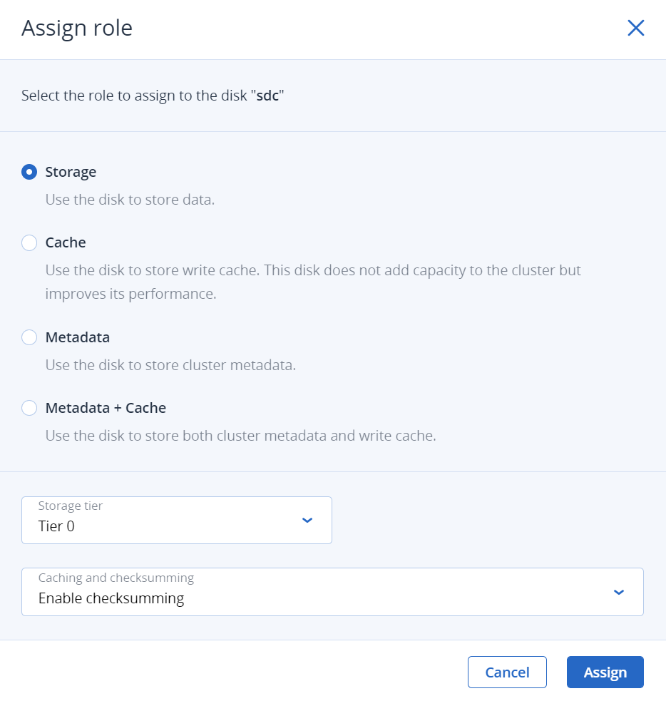 Например, чтобы назначить роль cs для диска sdc на узле node003, запустите команду: